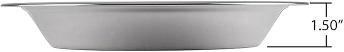 - Heavyweight durable material has even heat distribution. Highly polished mirror-like finish prevents crusts from sticking to the pan. Doesn't tarnish and wear like aluminum so it always stays looking like new. Can go directly from freezer to the oven without damaging the pan. Measures 9-3/4" wide by 1-1/2" deep