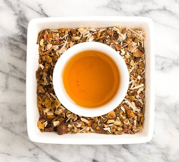We set out as a goal to create a powerhouse adaptogenic herbal chai — free of caffeine and any flavorings, fruits, or florals. The result of this year-long development process is simple in name only. This complex blend of twelve adaptogens is both amazingly delicious and fantastically grounding. Its aroma is honeyed and spicy. The flavor is refreshing, sweet and well-rounded, yet earthy. Its sweet peppery notes may remind you of a gingersnap cookie. There’s a slight smokiness coated with notes of maple syrup. The resulting infusion has tons of body and soothing throat-coating character. Most importantly, this adaptogenic herbal tea is formulated with the goal of helping you find your center, whatever the circumstances.