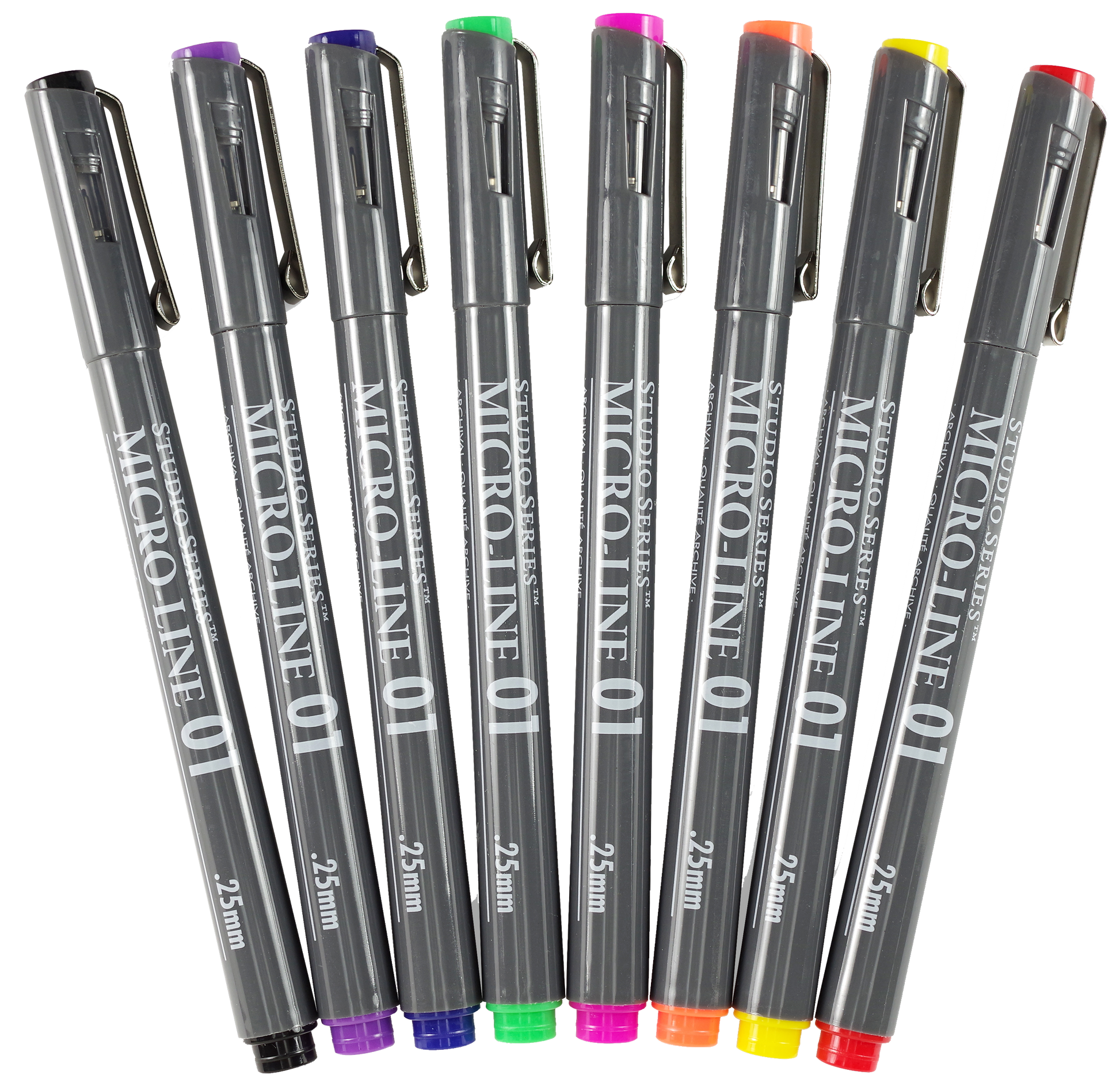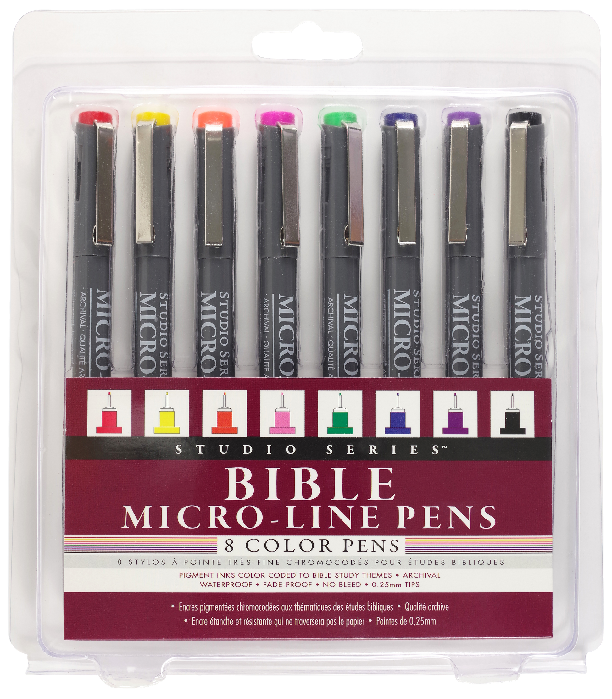 8 Bible-safe fine-line pens are perfect for underlining and note-taking! Color-coded to represent Bible study themes. 7 colors plus black. Archival pigment inks. Waterproof and fade-proof. No bleed-through. 0.25mm tips. Easy-storage clamshell case keeps pens safe on the go. Case measures 5.325'' wide x 7'' high.