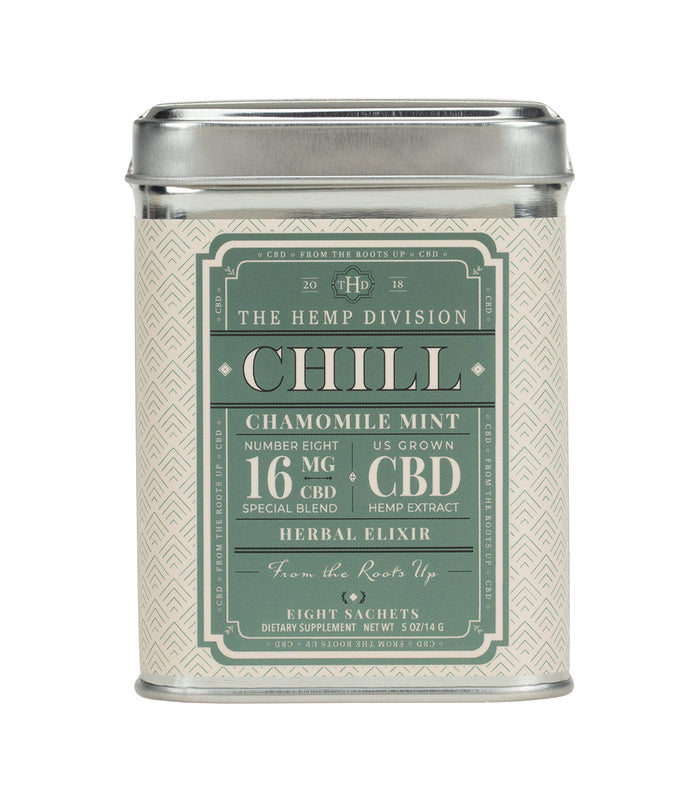 Enjoy relaxation at its finest anytime and anywhere with our hemp-infused Chill tea. In the foreground, each sip contains caffeine-free chamomile with a bright dash of peppermint. Together, the flavors blend beautifully to indulge and relax the senses in one smooth, chilled-out cup. The finishing touch: 16 mg of premium Hemp Extract. Perfect for unwinding after a long day or simply easing tension whilst at work. Try adding a swirl of honey for sweetness!*