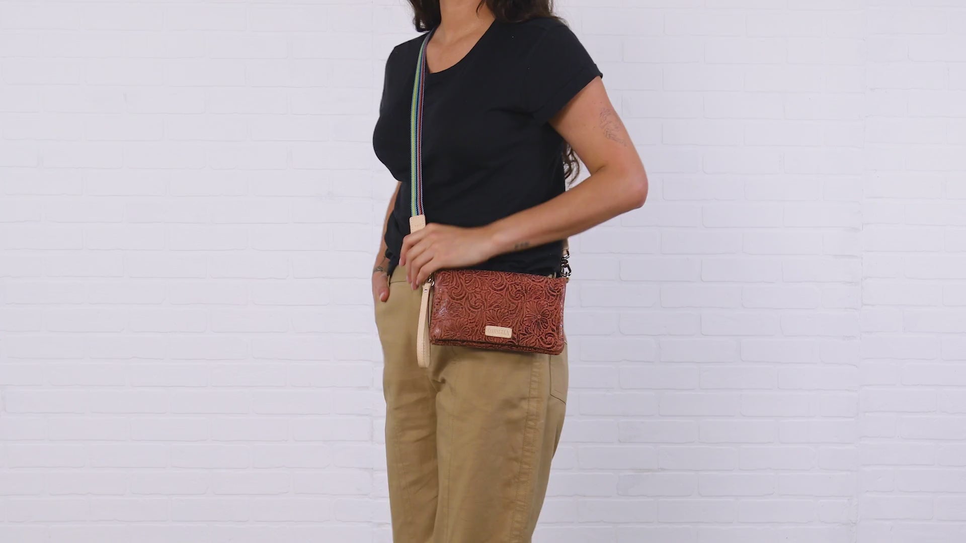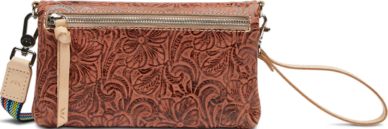 - Included wristlet strap and adjustable crossbody strap