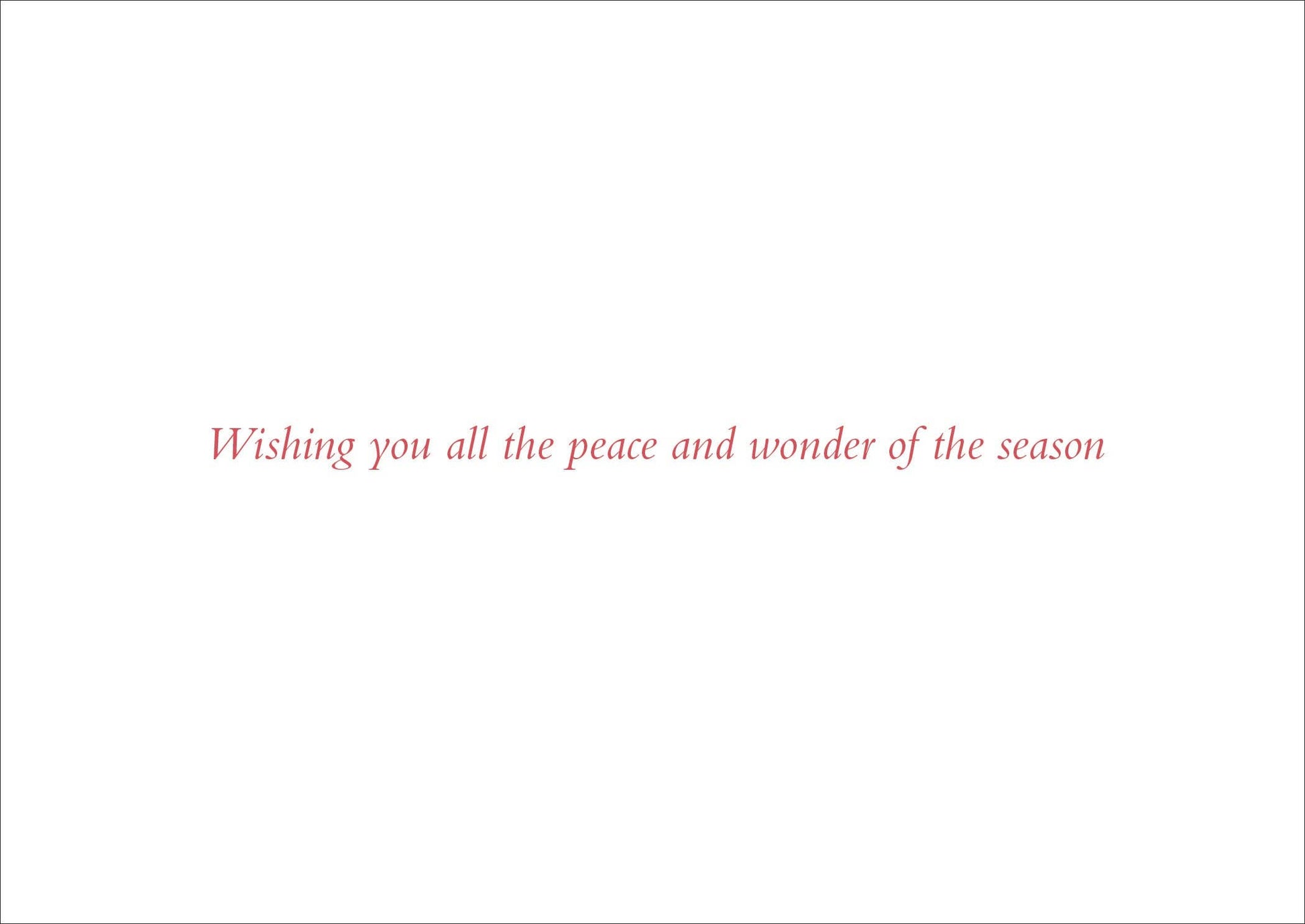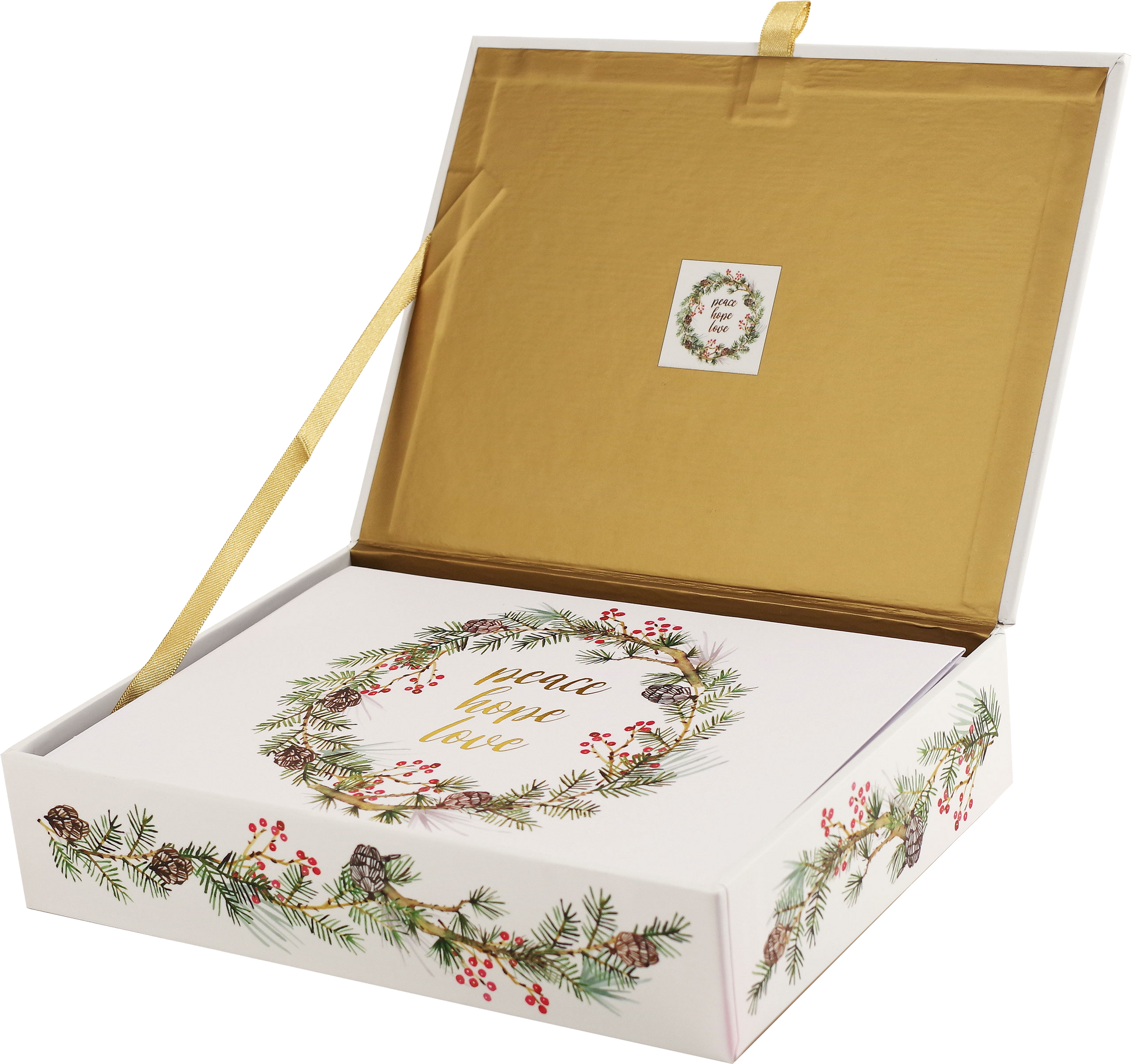 A simple evergreen wreath, embellished with red berries and pinecones, surrounds the words ''peace hope love,'' stamped in gold foil. Premium card set includes 20 cards, 21 envelopes, and a matching keepsake box. Larger cards provide ample space for personal messages. Cards measure 7'' wide x 5'' high. Smooth card interiors are uncoated. Quality card stock supports pen beautifully. Inside greeting: Wishing you all the peace and wonder of the season The white stationery envelopes included are self-sealing for your convenience -- simply peel and stick. Sturdy reusable box features a reproduction of the card design on the lid. A smaller image is replicated inside. Box comes with a ribbon tab, ribbon hinge, and magnetic closure. Perfect for storing notes, holiday mementos, postage stamps, and more!