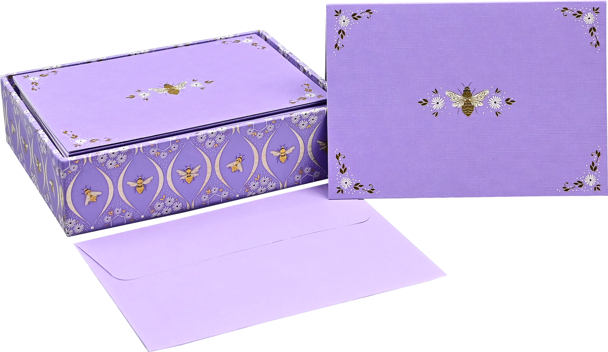 A beautiful bee, artfully framed with delicate white blossoms, is the focus of these elegant note cards. • Premium boxed stationery set comes with 14 note cards and 15 envelopes. • Card interiors are blank for your personal messages. • Uncoated card stock takes pen beautifully. • Substantially constructed matching stationery envelopes complete the set. • Envelopes are self-sealing for your convenience – simply peel and stick. • Card design is embellished with hand-selected touches of gold foil. • Suitable for a variety of occasions. • Beautiful note cards are a pleasure to use and to receive! • Cards measure 5'' wide x 3-1/2'' high.