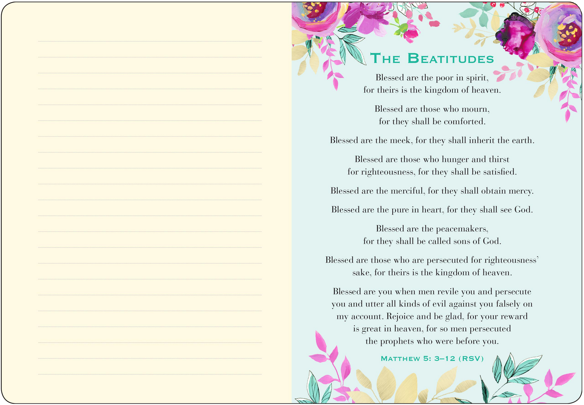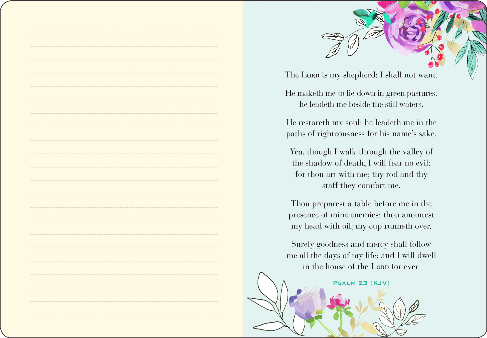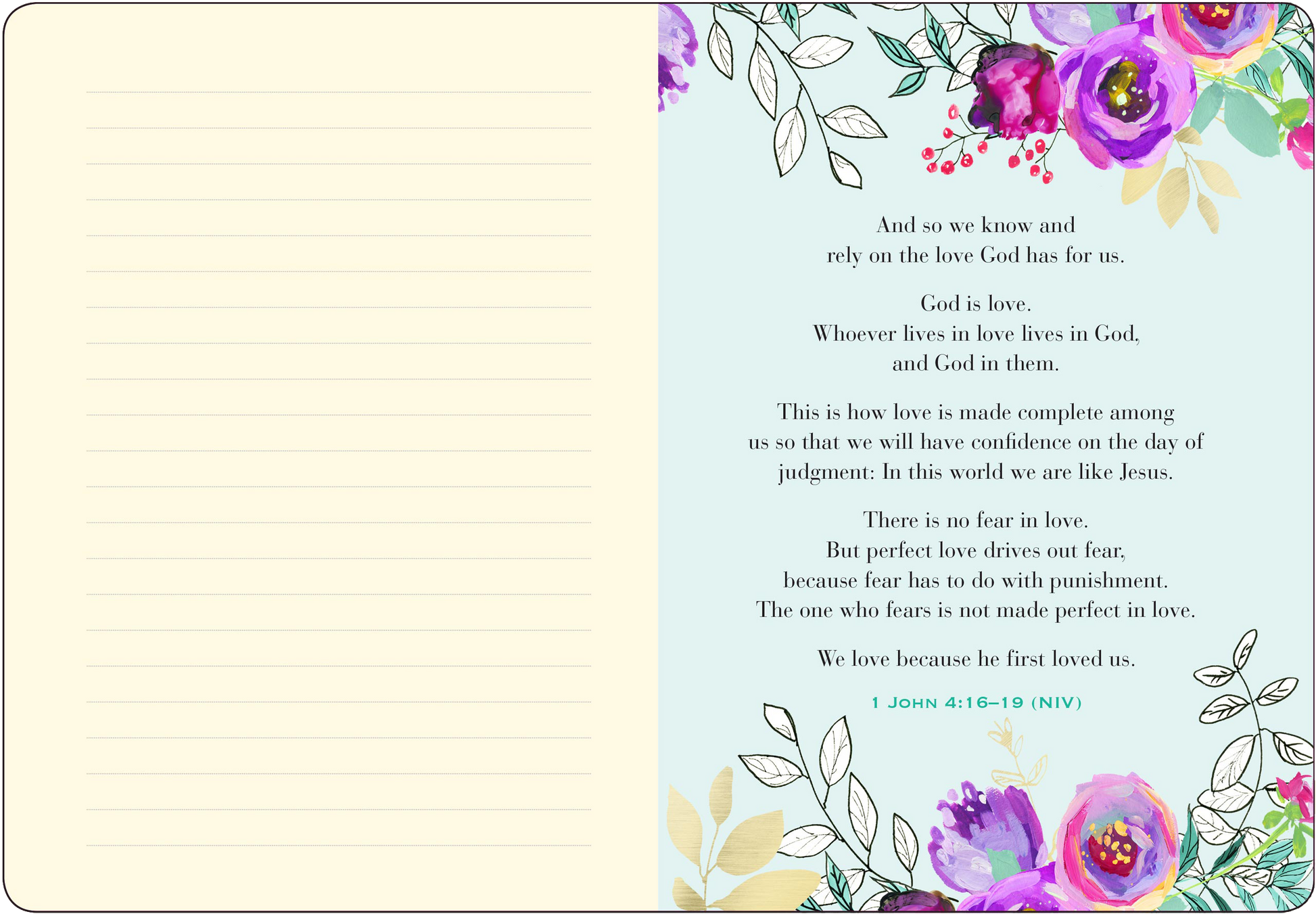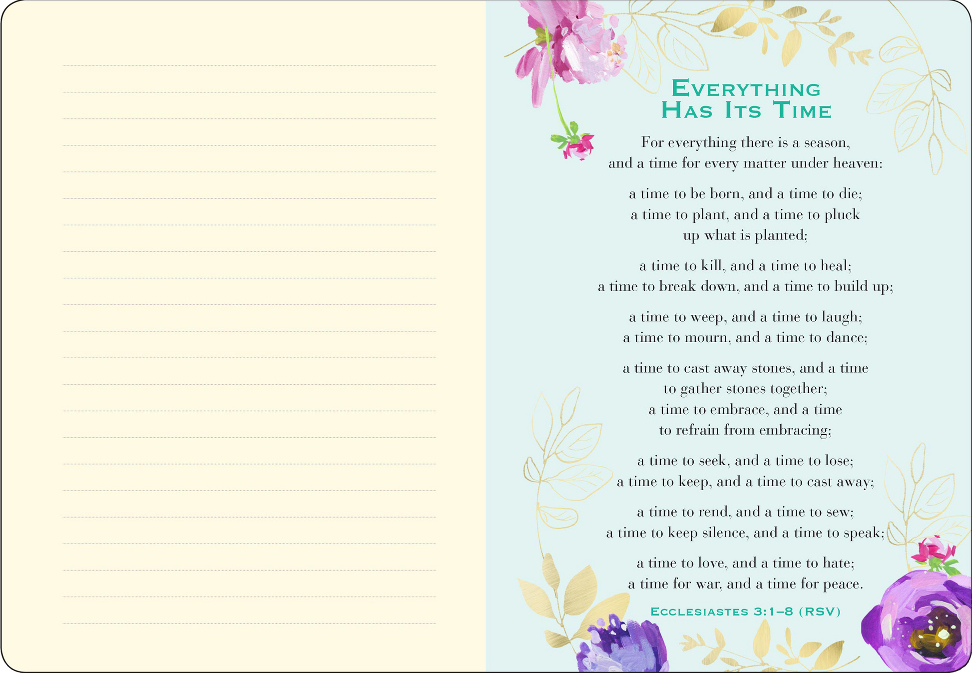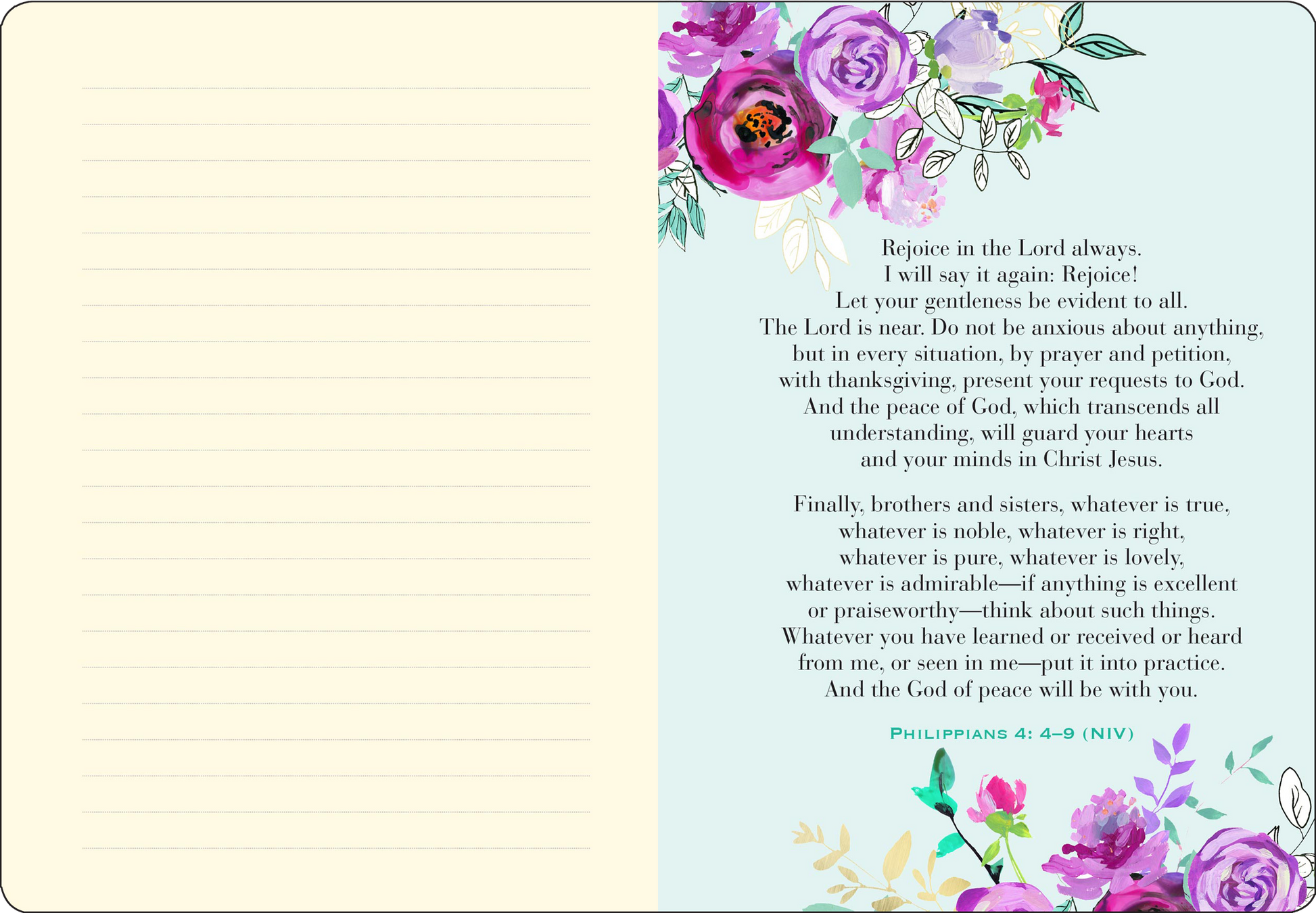 Beautiful journal features decorative stitching, soft, leather-like cover material, and 8 pages of Scripture passages to uplift and inspire! Crisp writing pages are perfect for personal reflections, sketching, or for recording favorite quotations, poems, or Bible verses. Premium 120 gsm paper takes pen or pencil beautifully. Paper is acid free and of archival quality. Light gray lines subtly guide your writing. A ribbon bookmark keeps your place. The inside back cover pocket expands to hold notes, cards, mementos, and more. A matching elastic closure secures your journal. Embossing adds texture and dimension to the cover design's floral motifs, and to the verse: ''For I know the plans I have for you'' --Jeremiah 29:11. 8 favorite Scripture passages are featured on colorful floral-design pages within. Complementary interior endpapers.