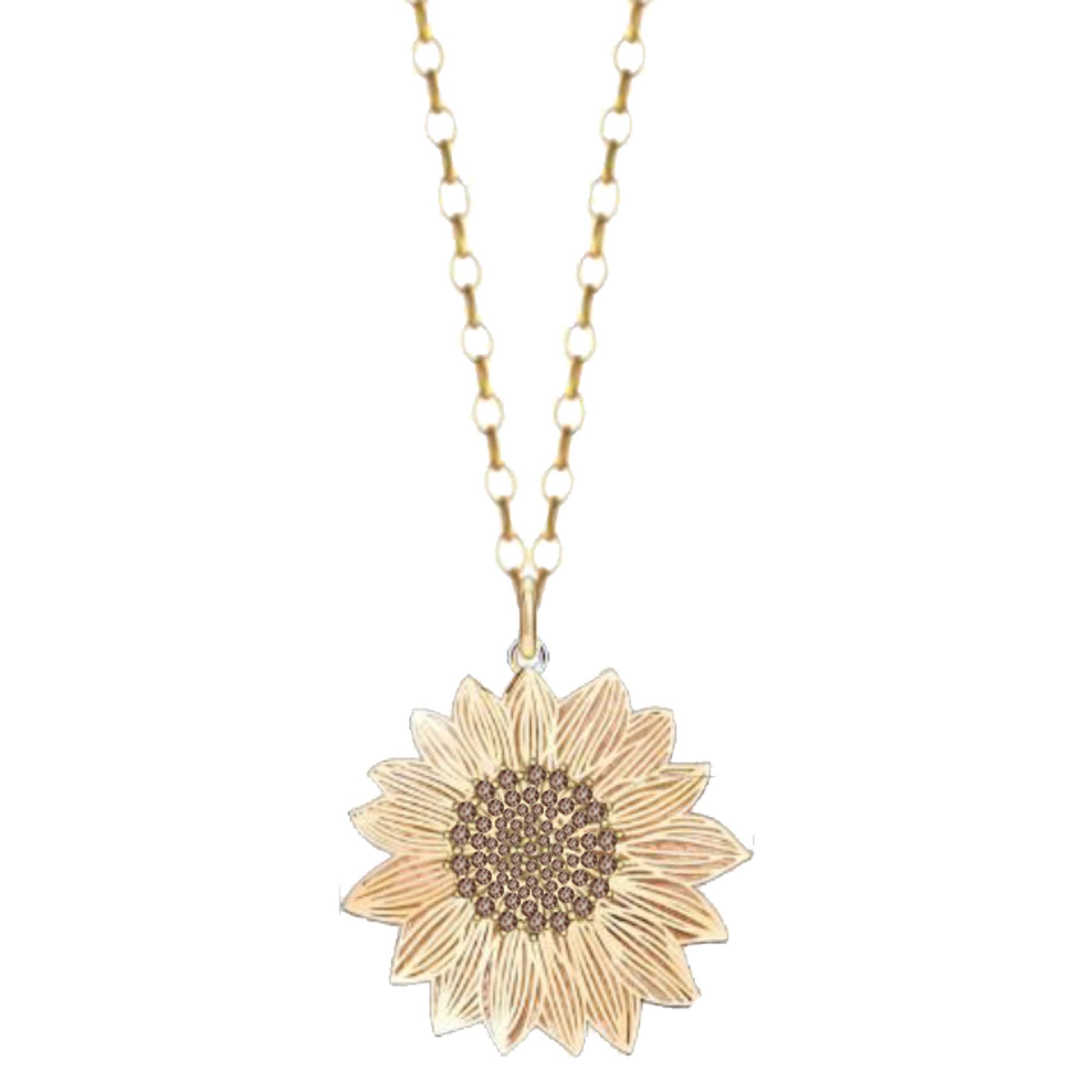 Showcasing the Amanda Blu's elegance, this Gold CZ Sunflower Necklace is a true symbol of beauty and charm. As part of our pendant/charm necklace collection, it embodies sophistication and grace. This piece, crafted with meticulous detail, offers a luxurious touch to any outfit. Ideal for treating yourself or as a meaningful gift for someone special. Enjoy the sparkle and allure of this unique sunflower necklace, a treasure waiting to be discovered.