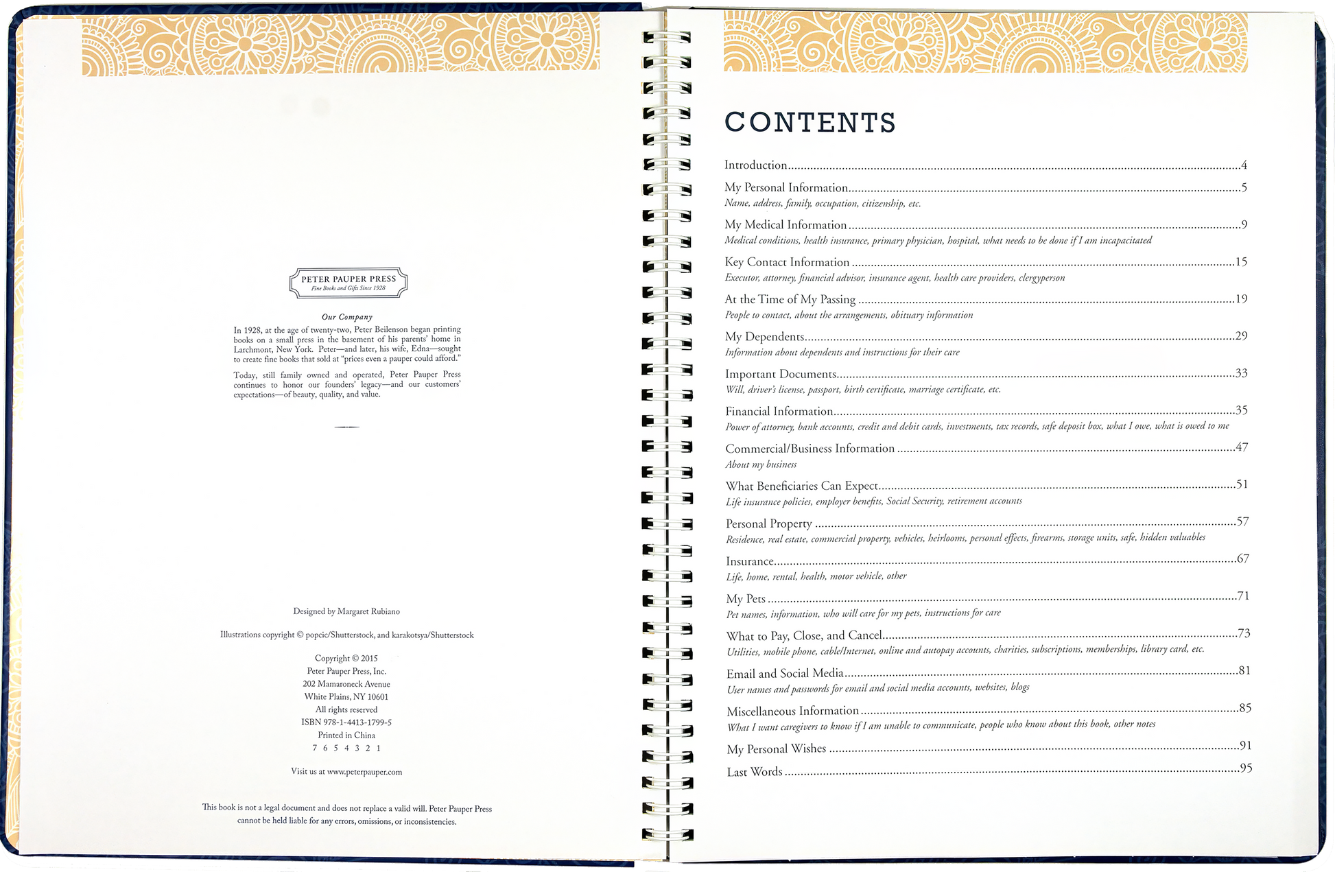 Yes, it has a quirky cover design that will appeal to certain sensibilities, but the contents of this peace-of-mind planner are no-nonsense. Use it to gather those vital details about your contacts, legal matters, health, financial affairs, instructions, and more. Enter the information in this guided planner, and keep it in a secure location. Valuable and practical, it is a tremendous gift for your family and personal representatives. The I'm Dead, Now What? Planner covers: My Personal Information My Medical Information Key Contact Information At the Time of My Passing My Dependents Important Documents Financial Information Commercial/Business Information What Beneficiaries Can Expect Personal Property Insurance My Pets What to Pay, Close, and Cancel Email and