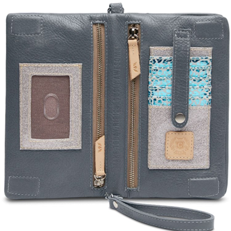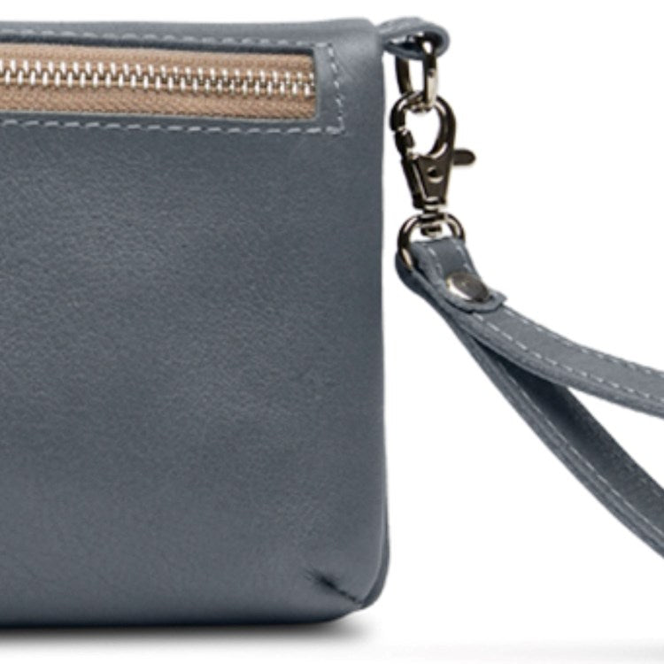 - Included detachable wristlet strap and adjustable woven crossbody strap