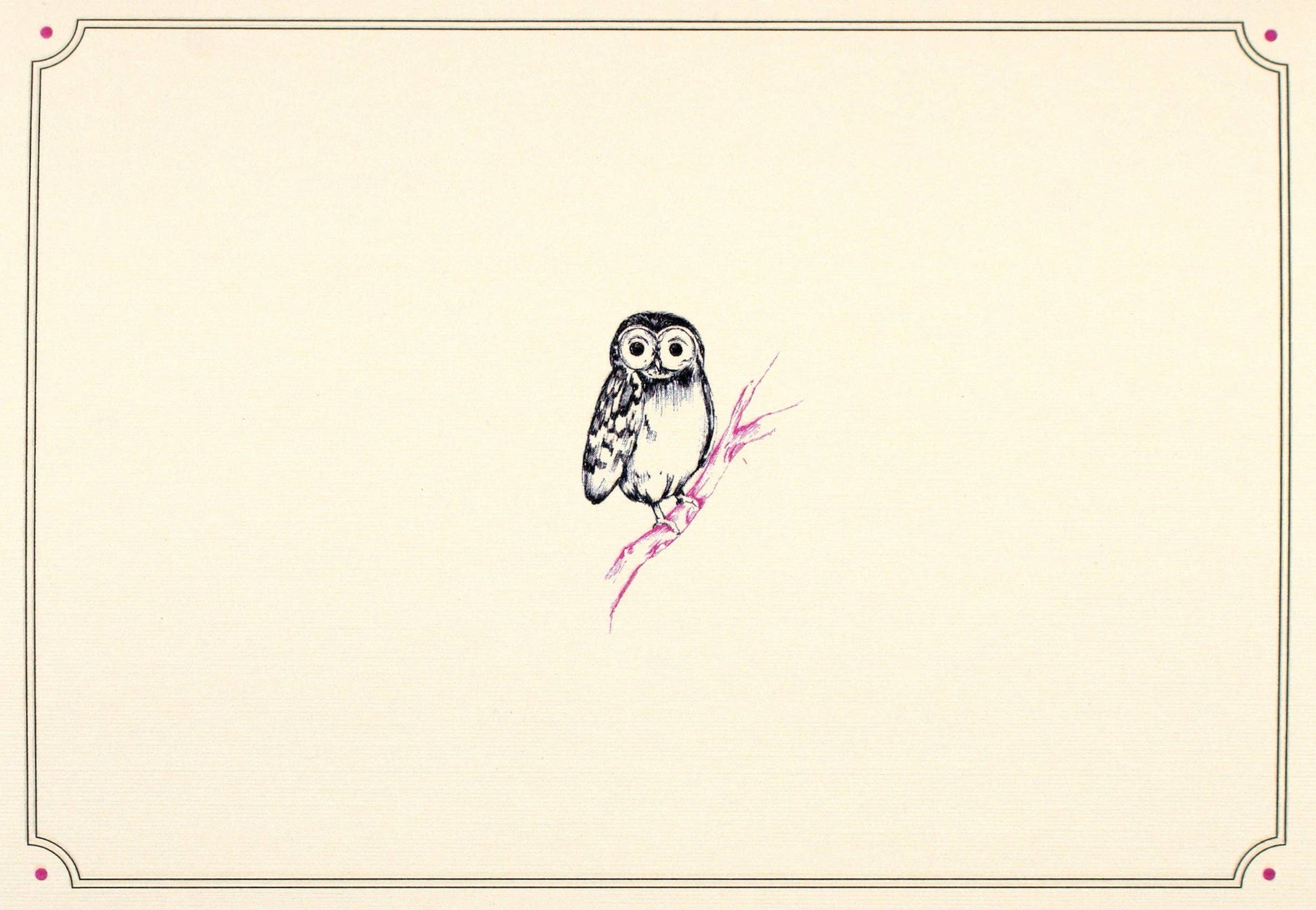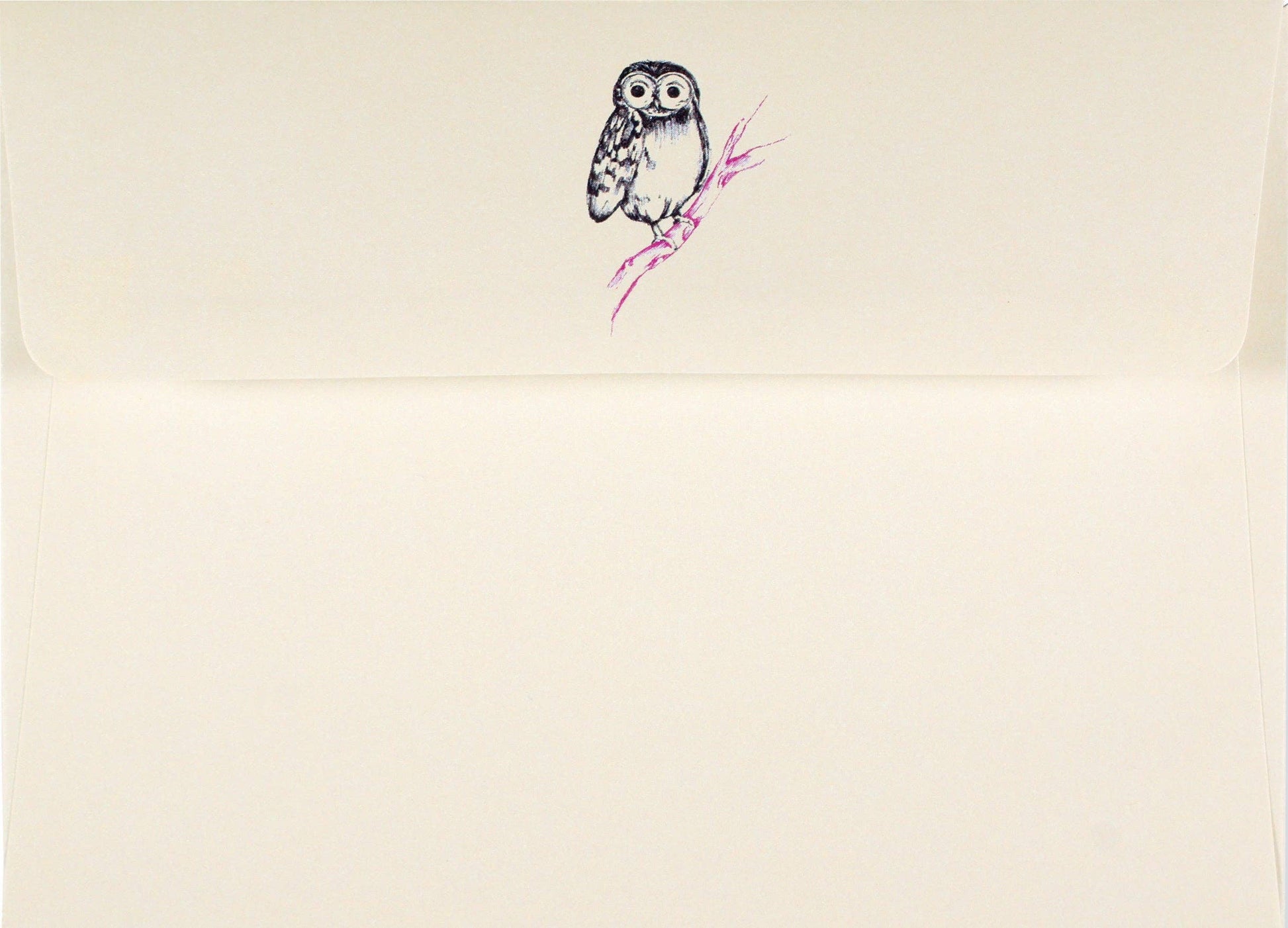 Little owl is waiting to deliver your personal message! Premium boxed stationery set comes with 14 note cards and 15 envelopes. Note card interiors are blank. Smooth-finish uncoated card stock takes pen beautifully. Card exteriors feature a crisp linen-like finish. Adorable owl stands out against its ivory background. Design is set off by an exterior border with four matching dots. Gloss highlights and raised embossing add visual interest. Matching stationery envelopes complete the set. The illustration of the owl is repeated on the envelope flaps. Cards are suitable for a variety of occasions. Note card set is suitable for gift-giving. Cards measure 5'' wide x 3-1/2'' high. Cards come in a matching board box with a clear acetate lid.