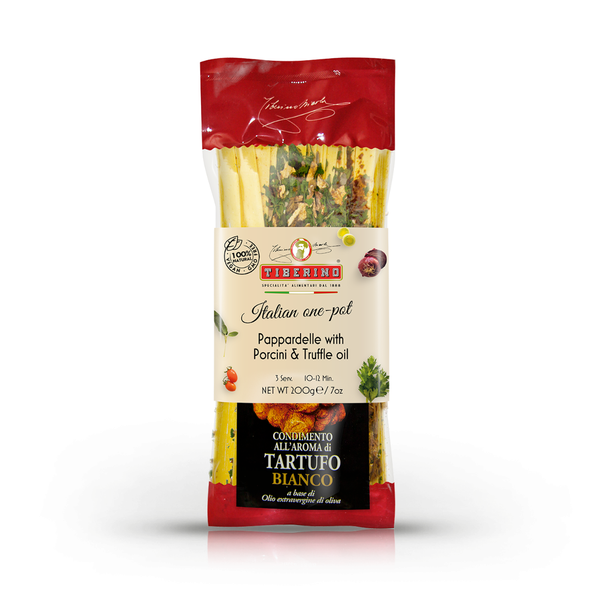 The package contains 100% natural ingredients, including pappardelle egg-pasta, porcini mushrooms, and a special seasoning blend.