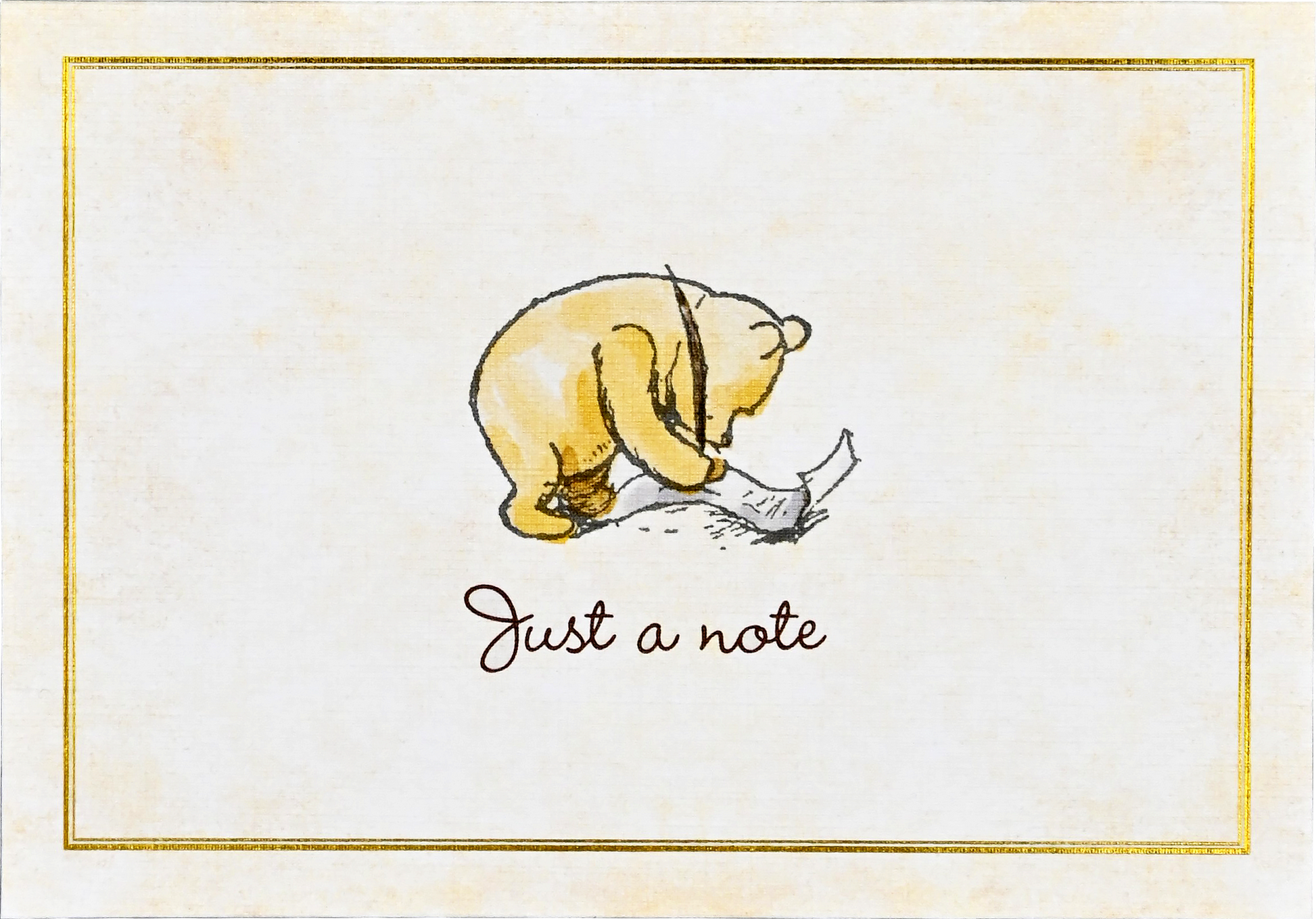 Enliven your correspondence with these delightful note cards! Charming Winnie-the-Pooh ''Just a Note'' design will add warmth to your every word. Deluxe stationery set comes with 14 note cards and 15 matching self-adhering envelopes. Card interiors are blank for your personal messages. Smooth-finish uncoated card stock takes pen beautifully. Card design is enhanced with gold foil highlights. Substantially constructed stationery envelopes ensure your messages arrive in pristine condition. Envelopes are self-sealing: Simply peel, press, and send your thoughts on their way! Card design is suitable for a variety of occasions. Cards measure 5'' wide x 3-1/2'' high. Perfectly complements Peter Pauper Press's other Winnie-the-Pooh gifts and stationery.